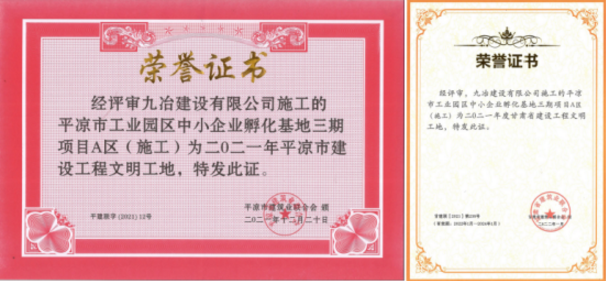 2022-03-02近日,平凉市建筑业联合会三届四次会议圆满召开,会议宣布了2021年度平凉市建设工程“三优一文明”获奖项目并颁发了省市级建设工程获奖荣誉证书,FUN88乐天使承建的平凉工业园区中小企业孵化基地(三期)项目A区获评“平凉市建设工程文明工地”和“甘肃省建设工程文